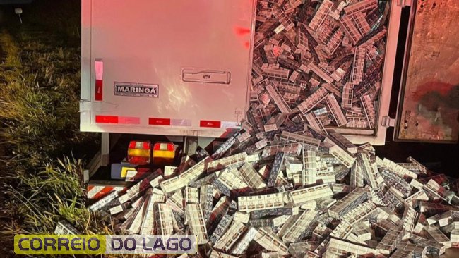 Ao abrirem o compartimento de cargas, os agentes constataram que o veículo estava completamente lotado com caixas de cigarros de origem estrangeira. Além disso, foi identificado que o caminhão usava placas falsas.