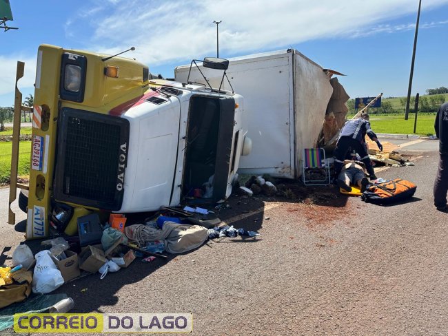 Um acidente foi registrado na tarde desta terça-feira (21) no trevo de acesso a Itaipulândia, na PR-497. Por volta das 15h, um caminhão que havia acabado de carregar em uma empresa no distrito de Caramuru, em Itaipulândia, seguia com destino a Cascavel quando o motorista perdeu o controle da direção, resultando no tombamento do veículo próximo ao trevo de entrada da cidade.