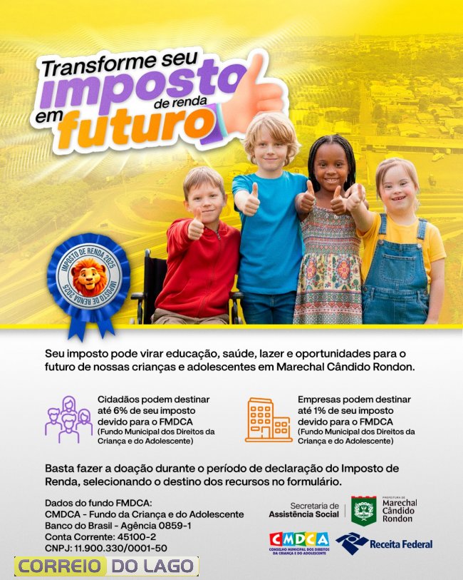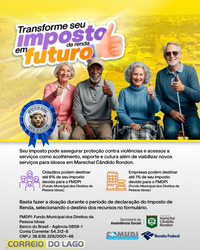 Com a proximidade do prazo para envio da declaração do Imposto de Renda 2026 (ano-base 2025), a prefeitura de Marechal Cândido Rondon, por meio da Secretaria de Assistência Social de Marechal Cândido Rondon, com aprovação dos conselhos municipais, reforça a importância da destinação de parte do imposto para projetos sociais do município.
