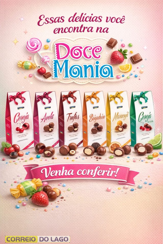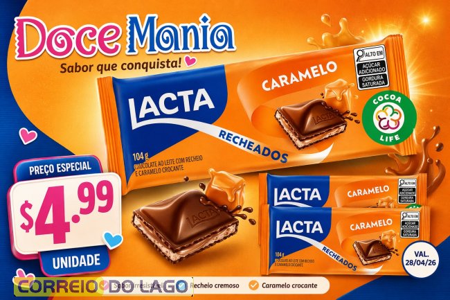 A Doce Mania, em Santa Helena, reúne uma grande variedade de doces para o dia a dia e também para presentear. Entre os destaques estão chocolates recheados, como o Lacta Caramelo de 104 g, com preço especial de R$ 4,99 a unidade, com validade até 28 de abril de 2026, além de balas, gelatinas e linhas conhecidas como Fini.