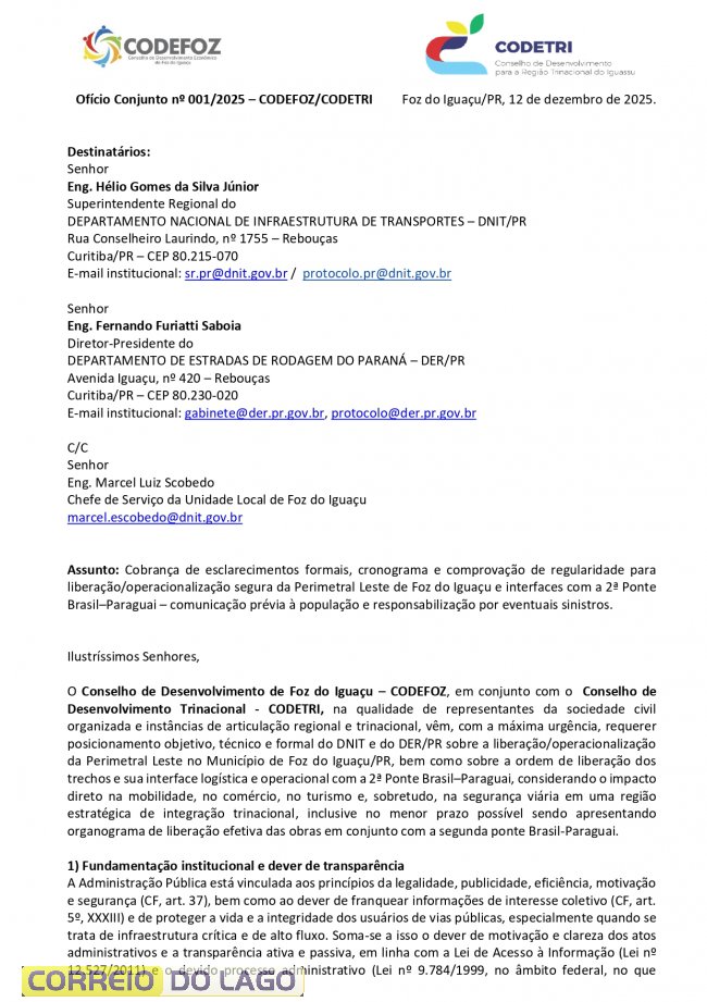 O Codefoz e o Codetri, conselhos de desenvolvimento de Foz do Iguaçu e da região trinacional, cobram respostas dos órgãos federal e estadual sobre a abertura, a operacionalização e o uso seguro da Perimetral Leste e da Ponte Internacional da Integração Brasil–Paraguai. O pedido da sociedade civil requer cronograma e evidências de regularidade nos procedimentos.