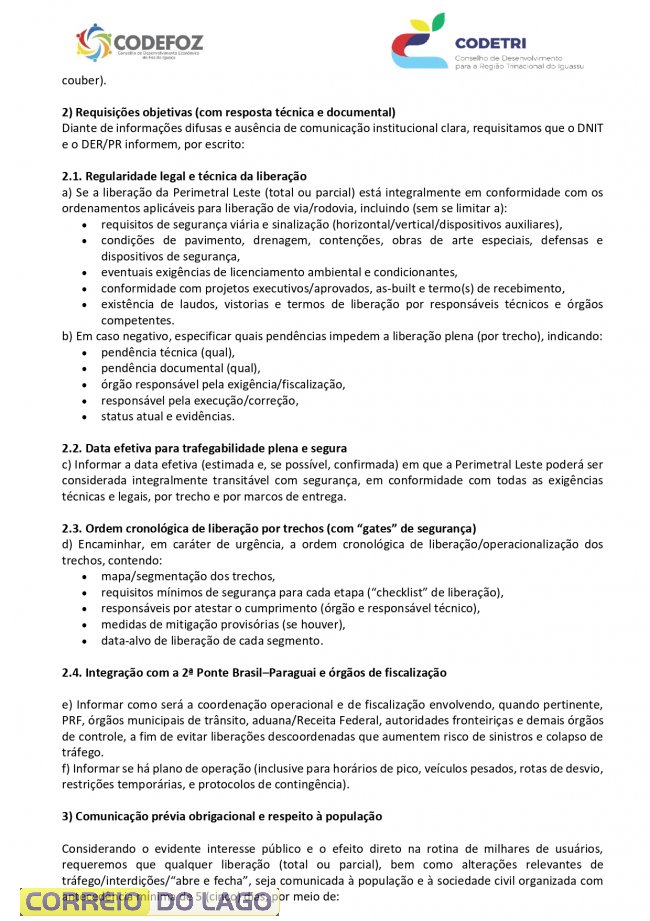 O Codefoz e o Codetri, ao reconhecerem a importância do trabalho para a conclusão das obras estruturantes, expõem o que classificam como “inconformismo institucional” da sociedade civil diante da insuficiência de comunicação e diálogo do poder público com a população e as entidades representativas. Também citam a percepção de entraves políticos e institucionais relacionados à agenda de inauguração, considerados inaceitáveis no contexto republicano.