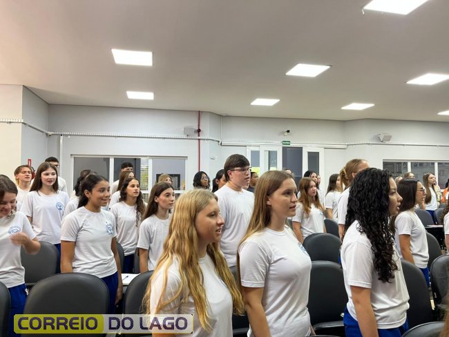 A Aula Magna contou com a participação das coordenadoras do Curso de Formação de Docentes, Adriela Sterchile Staub e Denise Rosane Calsing, que acompanham o trabalho pedagógico e formativo dos futuros professores, especialmente no que se refere à articulação entre teoria e prática docente.