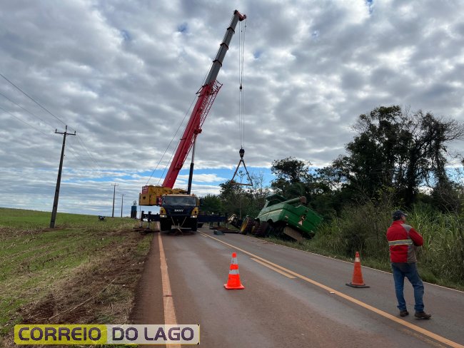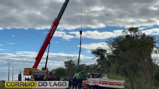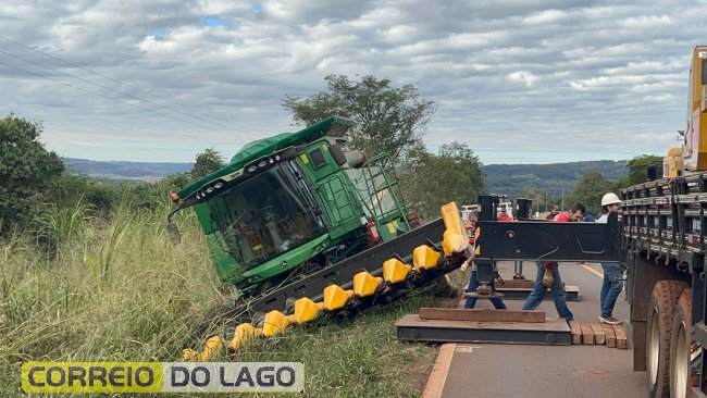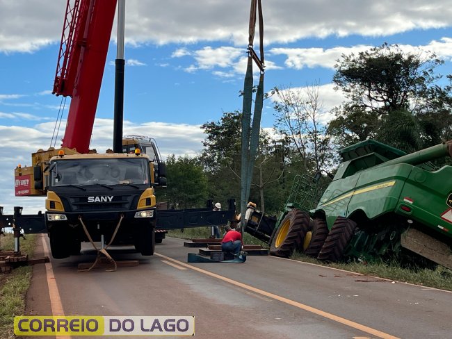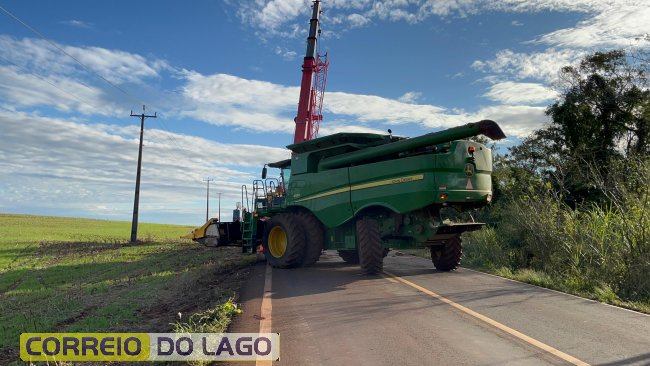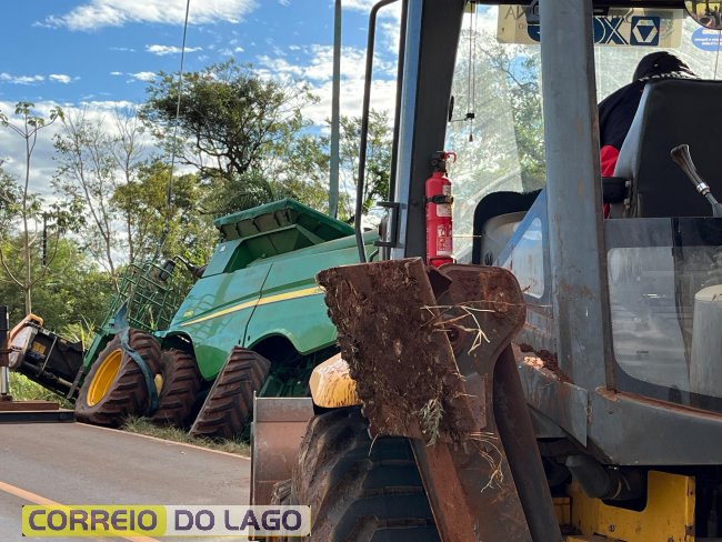Uma colheitadeira que ficou em situação de risco de capotamento às margens da PR-488, no trecho entre Santa Helena e Diamante d’Oeste, foi retirada com sucesso na tarde desta quarta-feira (25).