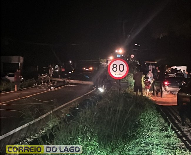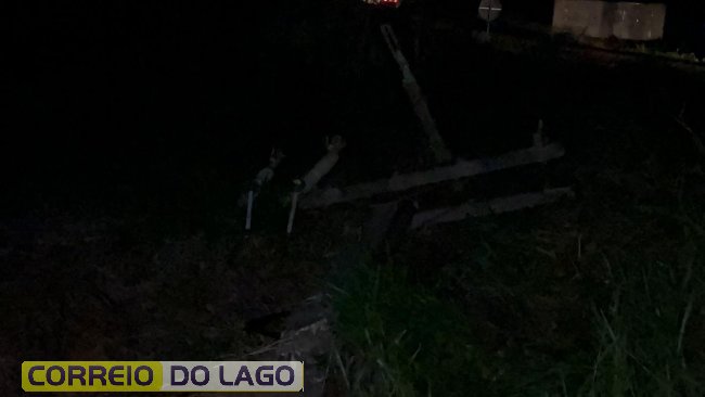 Com a força da colisão, dois postes foram completamente destruídos, evidenciando a gravidade do acidente.