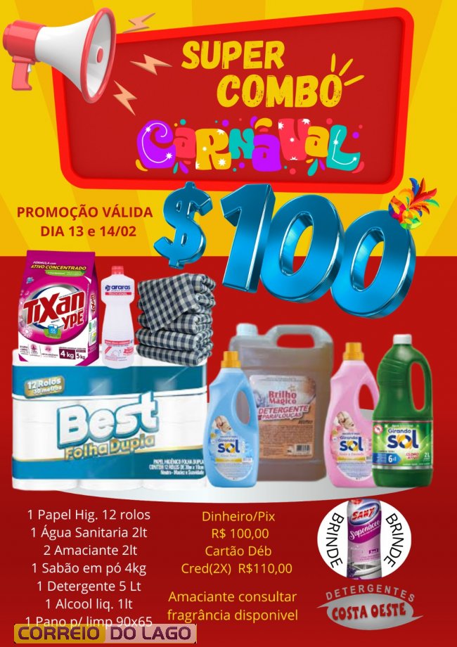 A Detergentes Costa Oeste prepara um Super Combo de Carnaval com produtos essenciais para a limpeza da casa por R$ 100 no pagamento em dinheiro ou Pix. O combo inclui papel higiênico com 12 rolos, água sanitária 2 litros, dois amaciantes 2 litros, sabão em pó 4 kg, detergente 5 litros, álcool líquido 1 litro e pano de limpeza 90x65. No cartão de débito ou crédito em até duas vezes, o valor é de R$ 110.