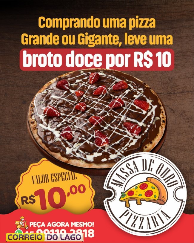 Nesta quinta-feira (30), a Pizzaria Massa de Ouro em Santa Helena preparou uma promoção que vai adoçar a noite dos clientes. Quem comprar uma pizza grande ou gigante pode levar uma pizza broto doce por apenas R$10, uma oportunidade para saborear mais opções por menos.
