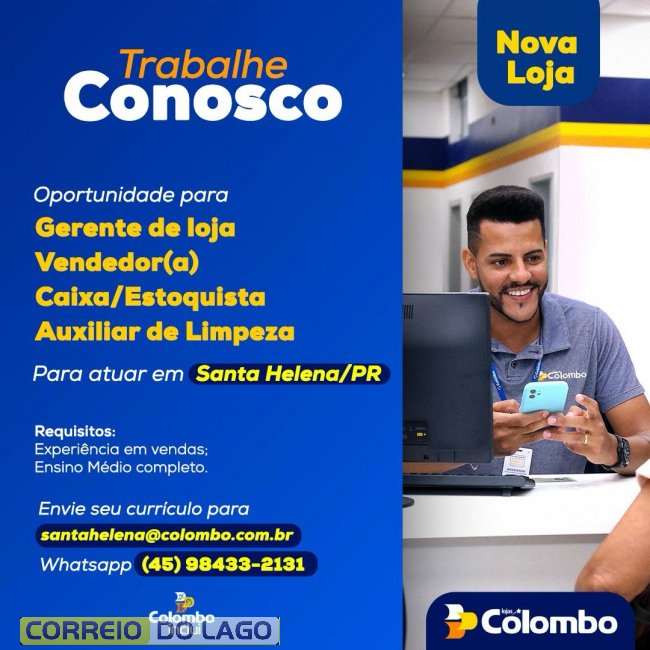 01-VENDEDOR EXTERNO MAIOR DE 18 ANOS, TER CNH “A” OU “B”, TER VEÍCULO PRÓPRIO E BOA COMUNICAÇÃO, TRABALHAR EM SANTA HELENA E REGIÃO.
