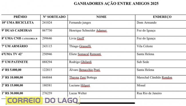 Confira os ganhadores da Ação Entre Amigos da Paróquia Santo Antônio de Santa Helena