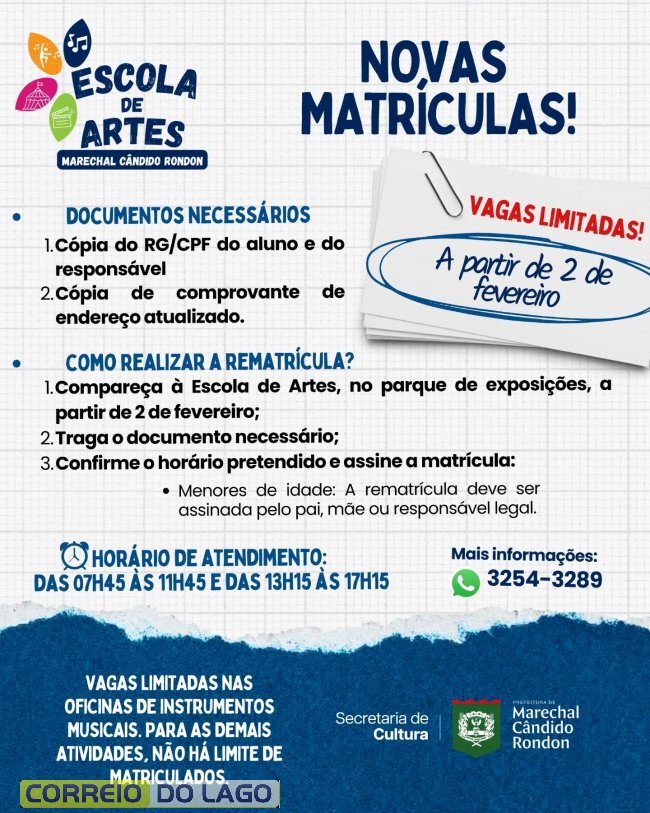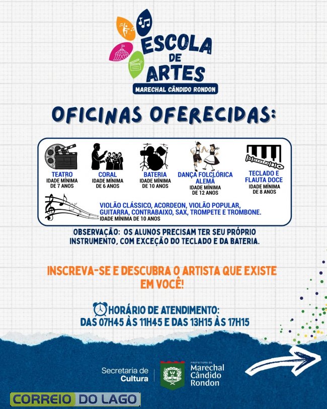 A prefeitura de Marechal Cândido Rondon, por meio da Secretaria Municipal de Cultura, informa que continuam abertas as matrículas para a Escola de Artes do município. As aulas têm início previsto para o dia 9 de fevereiro, com vagas gratuitas e limitadas.