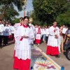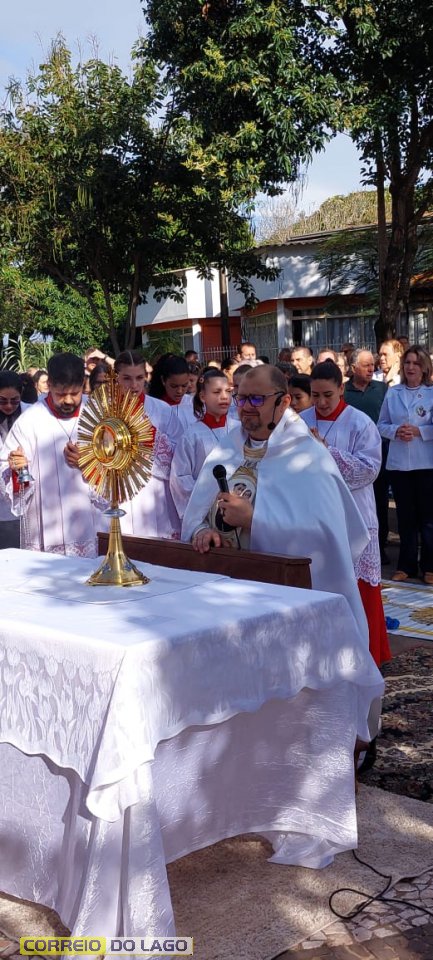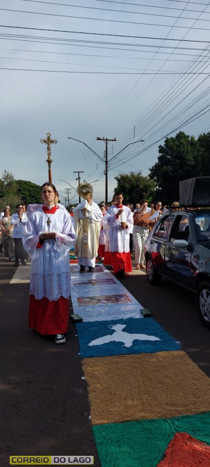 A programação religiosa contou com missa solene e, em seguida, a procissão do Santíssimo Sacramento, conduzida pelo pároco local. O percurso da procissão foi cuidadosamente decorado com os tapetes, por onde passou o ostensório com o corpo de Cristo, em sinal de reverência e comunhão com a fé católica.
