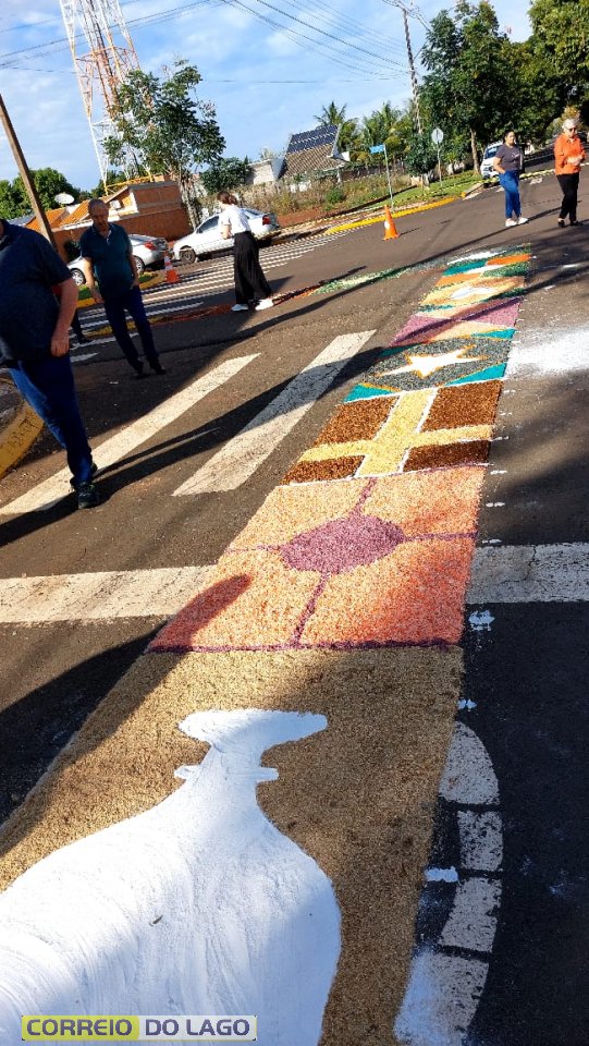 Desde as primeiras horas da manhã, grupos de famílias, catequistas, pastorais e membros da comunidade católica se dedicaram à montagem dos tapetes ao longo das ruas próximas à Igreja Matriz. Com serragem tingida, sal, tecidos, flores e outros materiais, os tapetes formaram imagens sacras, símbolos e mensagens de paz, gratidão e reflexão sobre a presença viva de Cristo na Eucaristia.