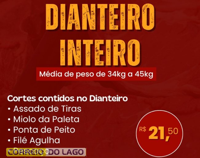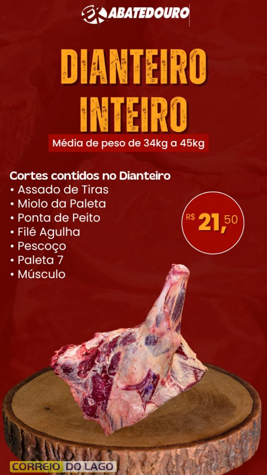 O quilo do dianteiro inteiro custa R$ 21,50, oferecendo qualidade e preço acessível aos consumidores. Passe no ER Abatedouro, em Santa Helena, e garanta a sua carne.