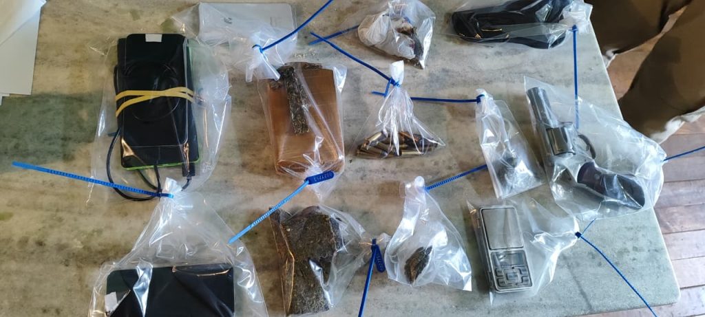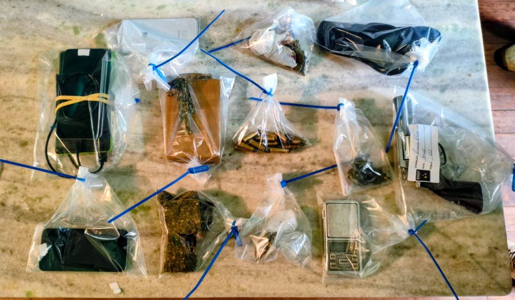 Na operação, foram apreendidos aproximadamente 522 gramas de maconha, uma balança de precisão, um revólver da marca Rossi calibre .38, 14 munições do mesmo calibre, um cartaz com desenho e a inscrição “mata os polícia é a meta”, além de três aparelhos celulares.