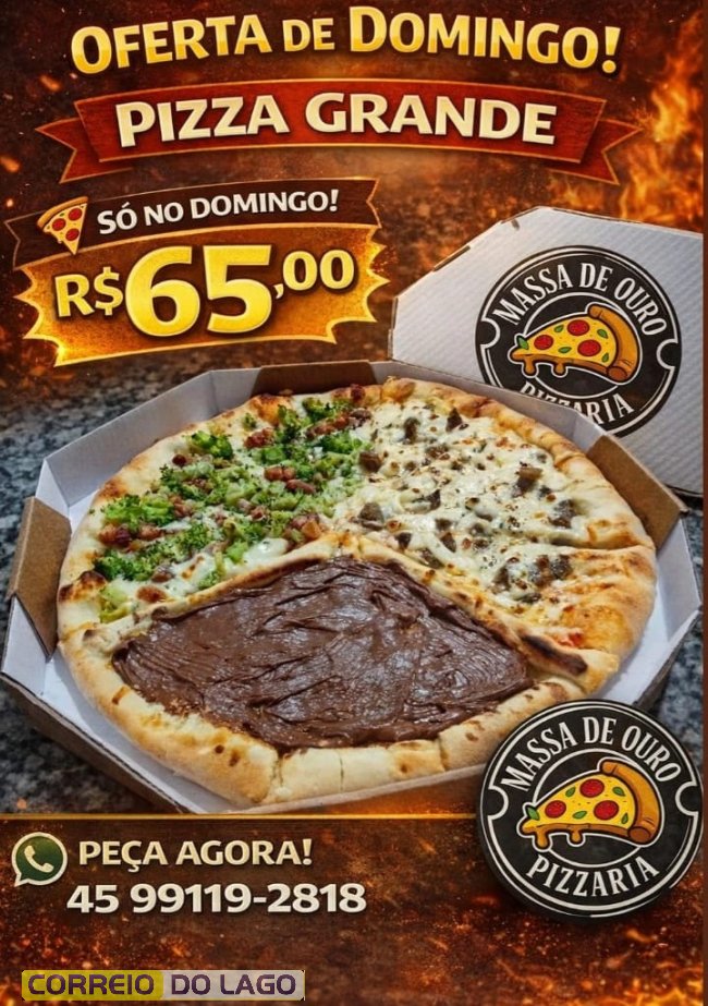 A Massa de Ouro preparou uma condição especial para o domingo, com pizza grande por R$ 65,00. Os pedidos podem ser feitos no período da noite, das 18h às 23h30, ideal para quem quer praticidade e sabor no jantar.