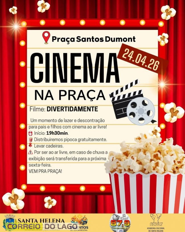 A Praça Santos Dumont, em Santa Helena, será palco de uma noite especial nesta sexta-feira (24), com a realização de mais uma edição do cinema ao ar livre promovido pela Prefeitura, por meio da Secretaria de Esporte e Lazer.