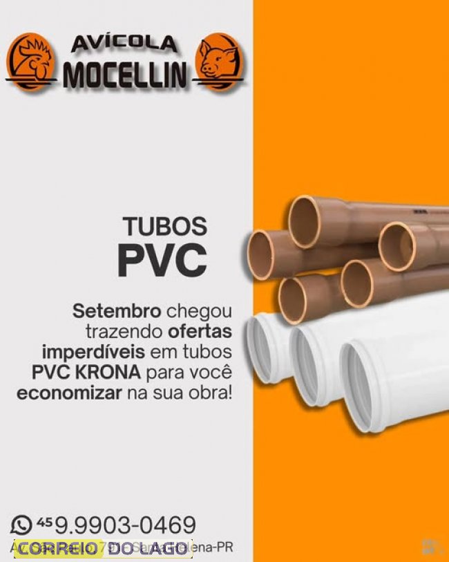 Neste mês, a Avícola Mocelin, em Santa Helena, tem tubos de PVC KRONA com preços reduzidos, tornando sua obra mais econômica e eficiente. A promoção inclui tubos soldáveis e para esgoto, atendendo a diferentes necessidades de construção e reforma.