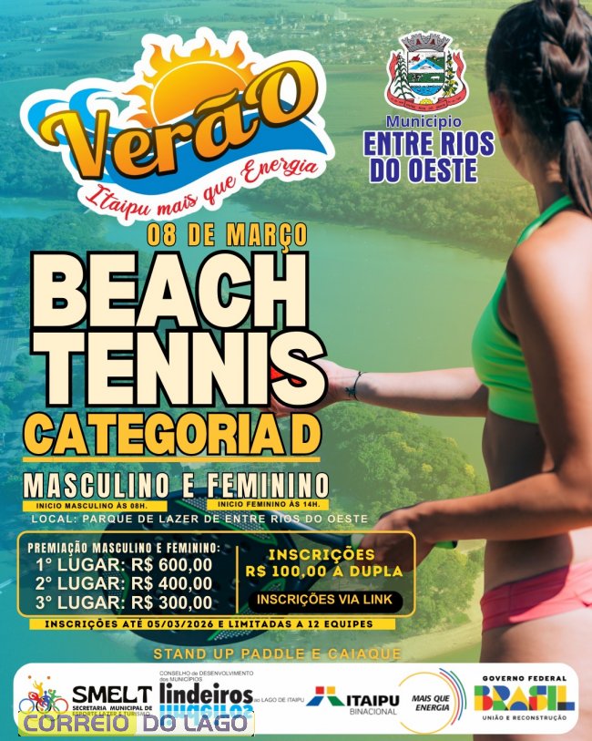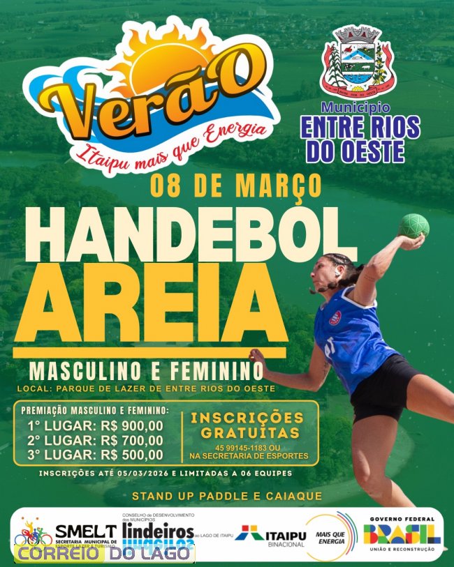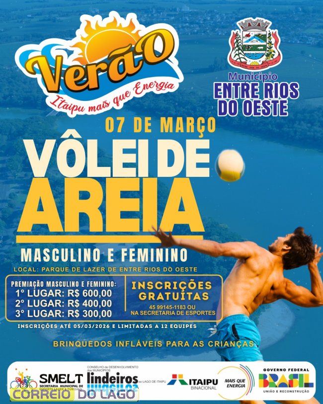 O município de Entre Rios do Oeste recebe, nos dias 07 e 08 de março, a etapa Verão Itaipu Mais que Energia 2026. O evento será sediado no Parque de Lazer (praia artificial) e reunirá competições de vôlei de areia, handebol de areia e beach tennis, em categorias masculinas e femininas.