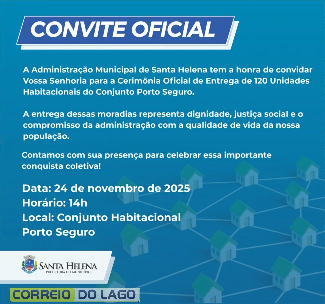 A Administração Municipal de Santa Helena realizará, nesta segunda-feira (24), às 14h, a entrega oficial das 120 unidades habitacionais do Conjunto Porto Seguro. As casas já estão concluídas, e as equipes da Prefeitura atuam apenas nos ajustes finais, como limpeza das vias e organização dos acessos, para garantir que o espaço esteja totalmente preparado para receber as famílias contempladas.