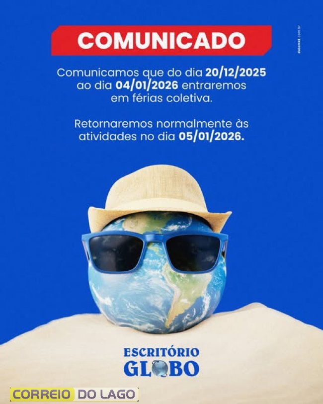O Escritório Globo em Santa Helena estará em férias coletivas de 20 de dezembro de 2025 a 4 de janeiro de 2026. Durante esse período, não haverá atendimento presencial nem remoto, e as atividades serão retomadas normalmente em 5 de janeiro de 2026.