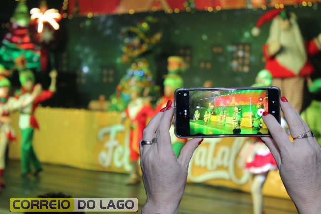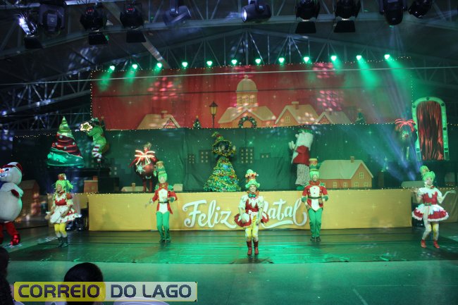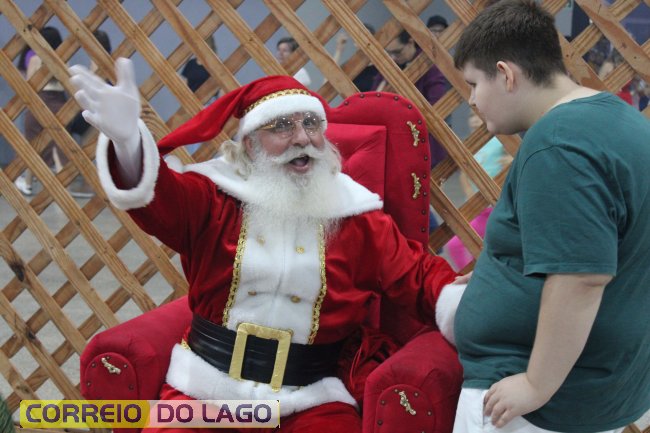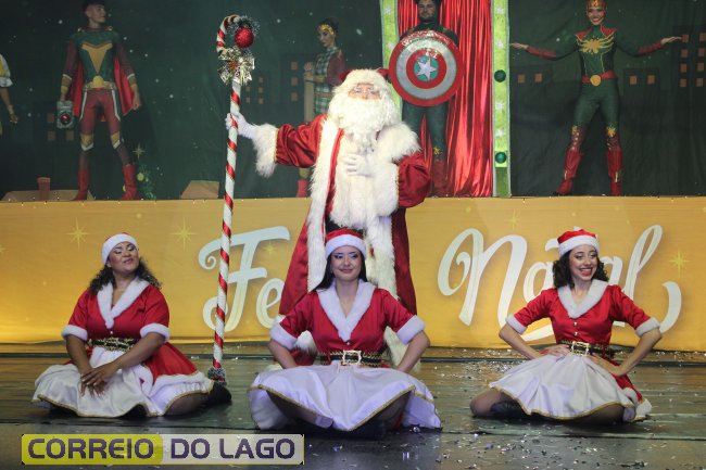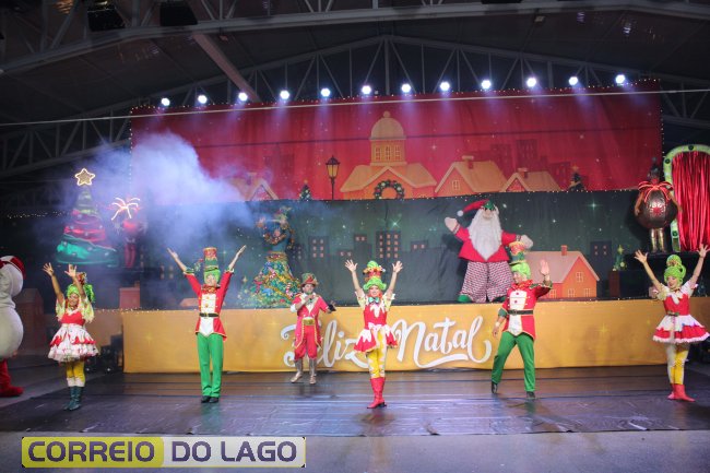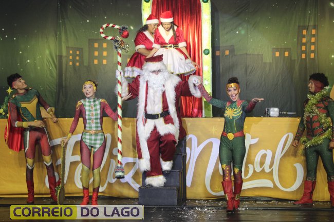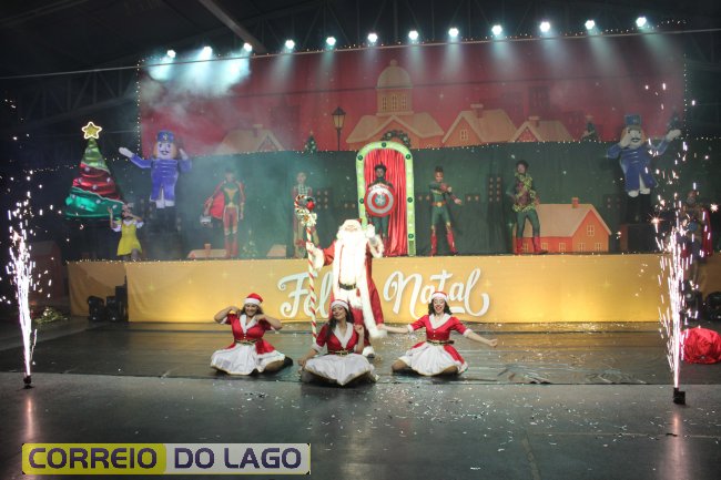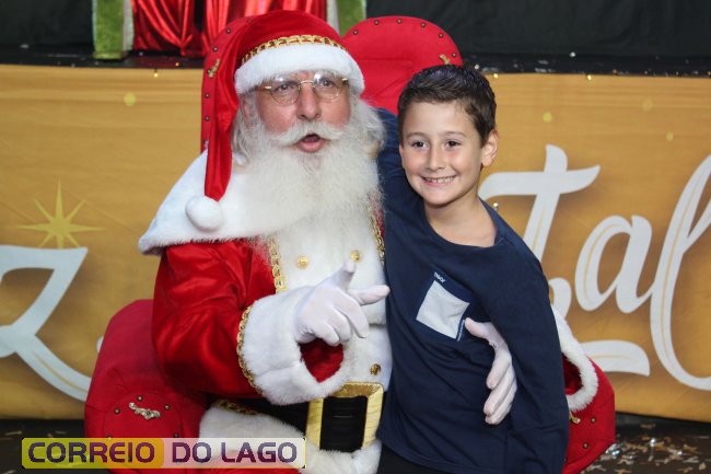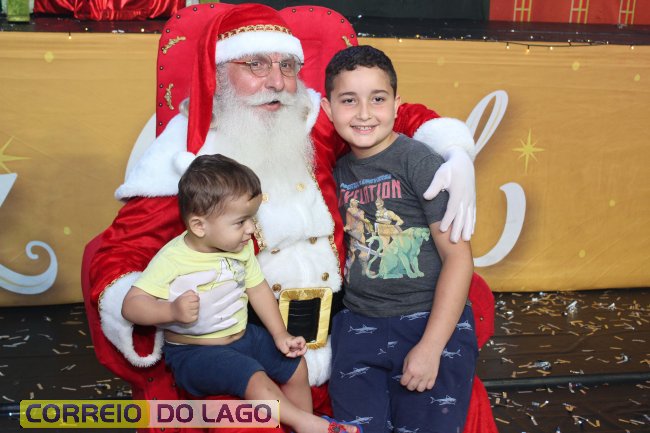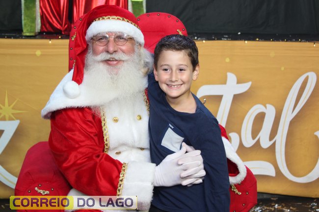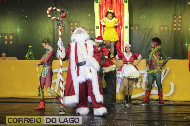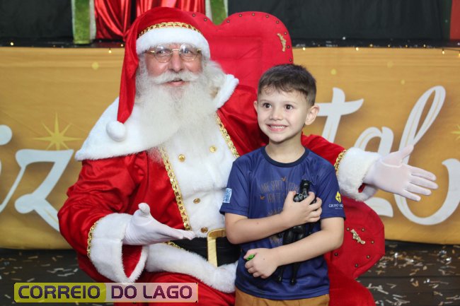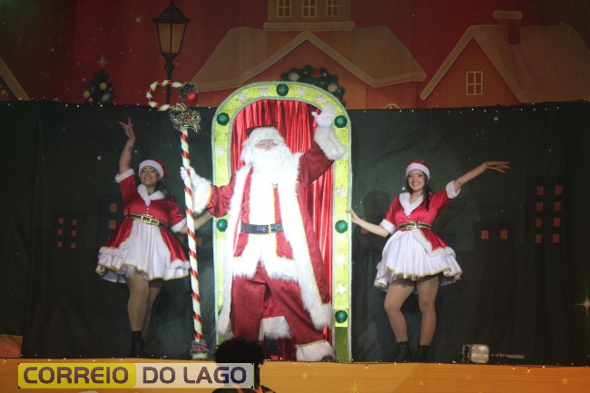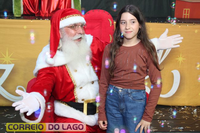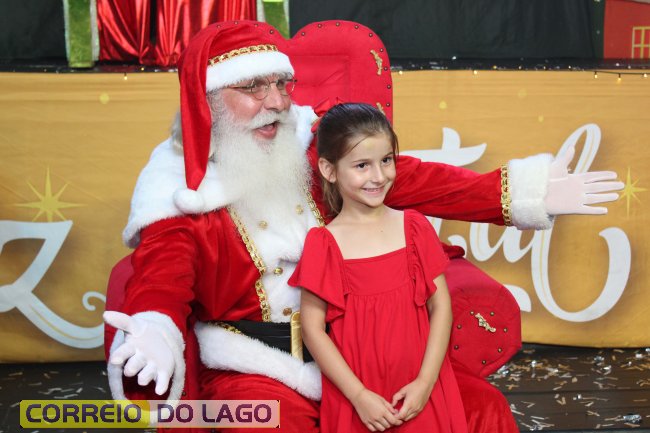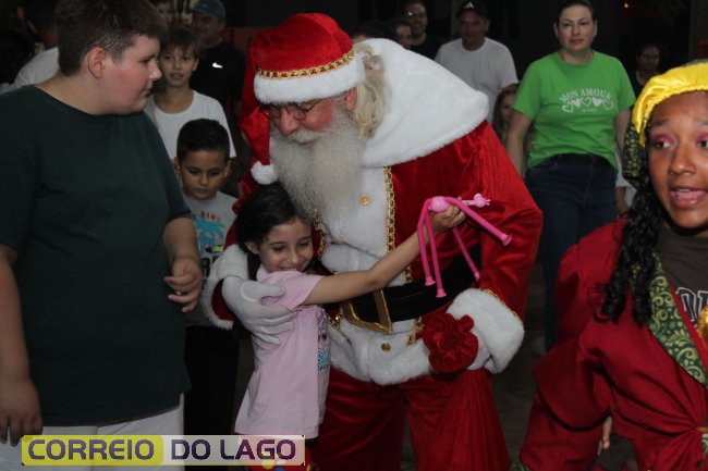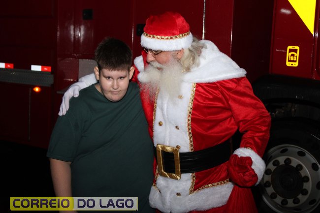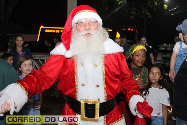 Um dos momentos mais aguardados da noite foi a chegada do Papai Noel, que encantou o público ao chegar em grande estilo no caminhão do Corpo de Bombeiros, arrancando sorrisos, aplausos e brilho nos olhos das crianças.