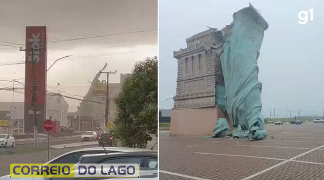 Um monumento que simula a Estátua da Liberdade, que fica em frente à loja Havan de Guaíba, na Região Metropolitana de Porto Alegre, desabou durante o temporal que atinge a cidade nesta segunda-feira (15).