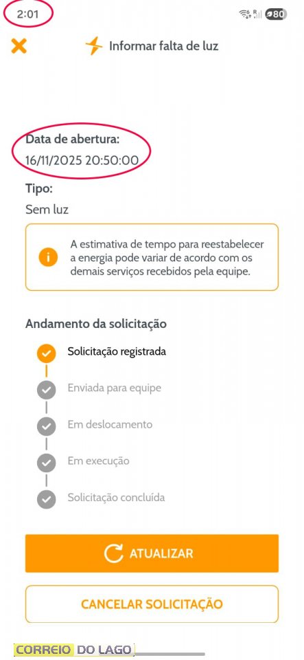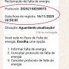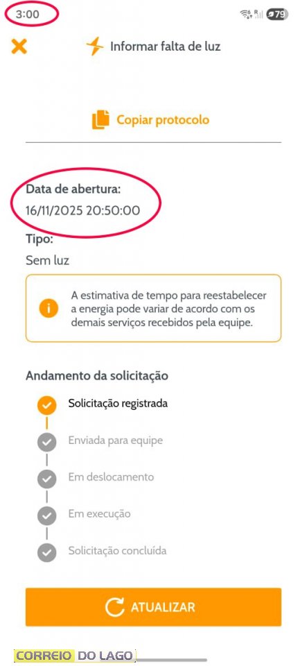Abaixo podemos observar os horários em que os protocolos eram verificados. Inicia os 8h50min (20h50), depois quase de hora em hora, madrugada a dentro, sendo o último as 11h10, vindo a energia ser reestabelecida as 11h43min desta segunda feira (17), quase 15 horas após a interrupção.