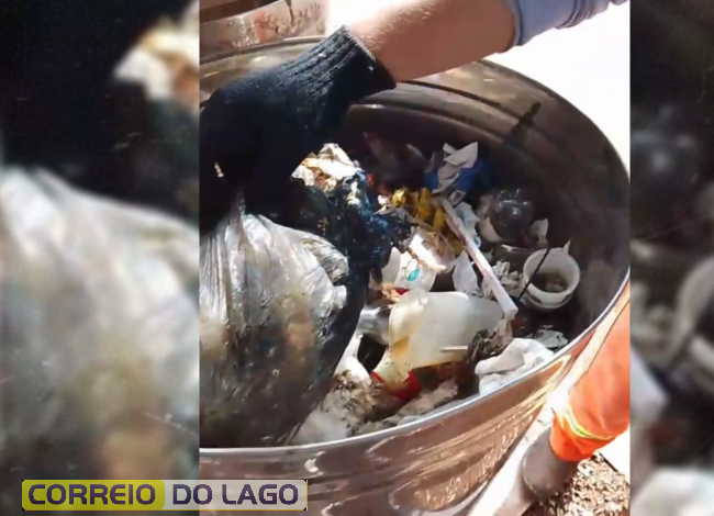 No local, sacolas com restos de comida, copos plásticos e outros materiais recicláveis estavam descartados de forma inadequada, dificultando o trabalho dos coletores e comprometendo todo o processo de reciclagem.