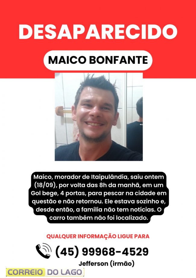 Um morador de Itaipulândia, identificado como Maico Bonfante, está desaparecido desde a manhã de quinta-feira (18). Segundo informações da família, ele saiu por volta das 8h em um veículo Gol bege, quatro portas, com destino a uma pescaria na própria cidade, mas não retornou.