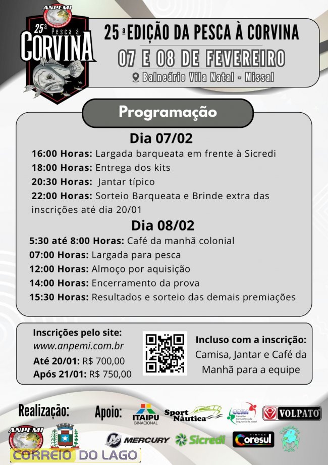 O evento é organizado pela Anpemi (Associação Náutica de Pesca Esportiva de Missal) e conta com o apoio da Administração Municipal de Missal, integrando a programação dos 43 anos de Emancipação Política Administrativa do município. Inicia as 16h de sábado, 07 de fevereiro, com a Barqueata, saindo da avenida Dom Geraldo Sigaud até a Prainha e encerra com o sorteio dos prêmios no domingo, dia 08.