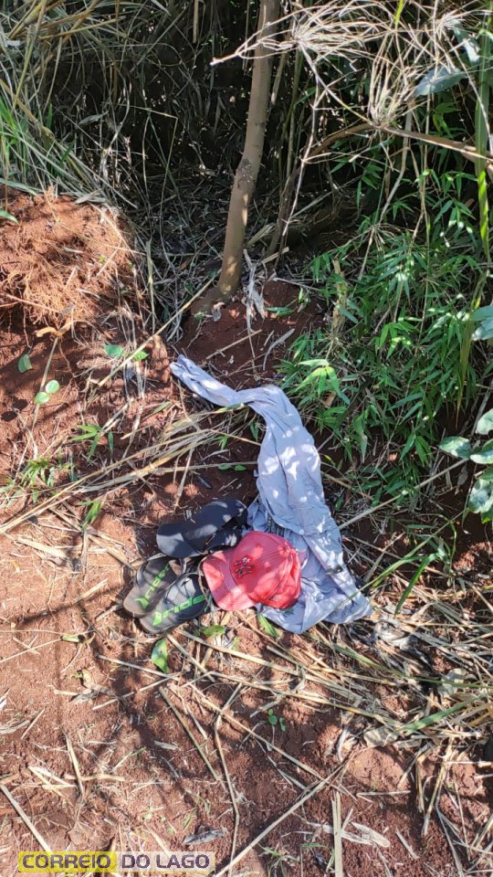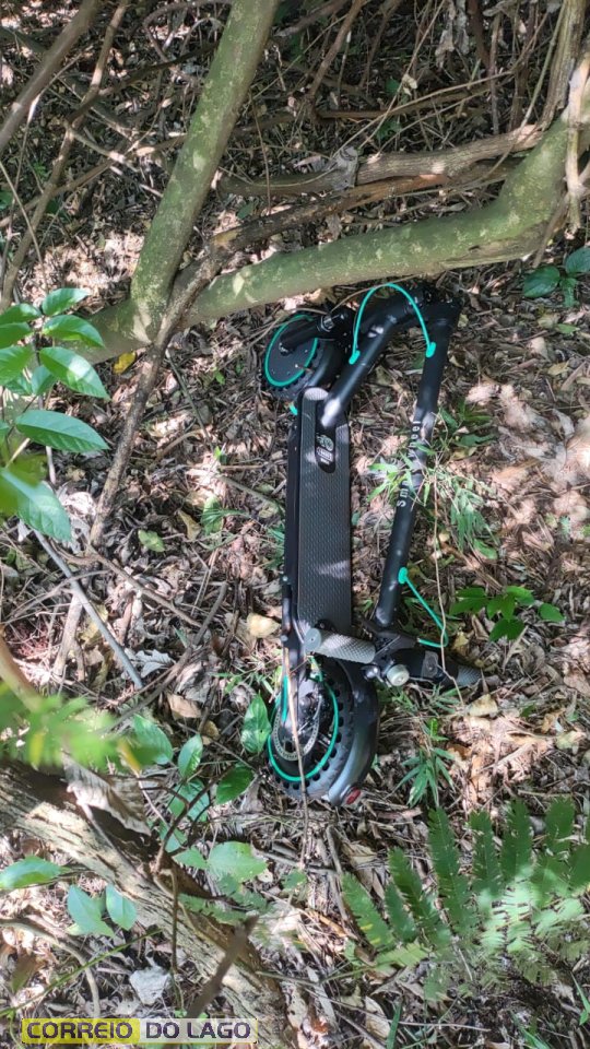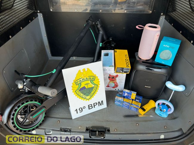 Mais tarde, por volta das 8h35, em continuidade às diligências e após análise das imagens de segurança, a equipe policial localizou os objetos furtados abandonados em uma área de mata próxima ao comércio. Entre os itens recuperados estavam caixas de som, dispositivos eletrônicos, maços de cigarro, uma mochila com luva e uma faca de serra, além de vestimentas utilizadas pelos autores. Também foi encontrado um patinete que havia sido levado no arrombamento.