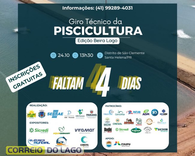 Nesta sexta-feira (24), será realizada a edição “Beira Lago” do Giro Técnico da Piscicultura, um evento voltado a produtores, profissionais do setor e estudantes interessados em se atualizar sobre as tendências e inovações do mercado da piscicultura comercial, tanto para integração quanto para produtores independentes.