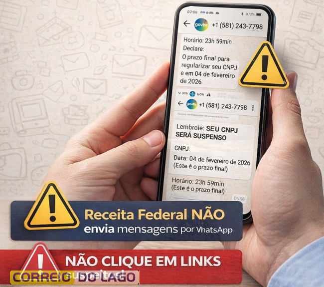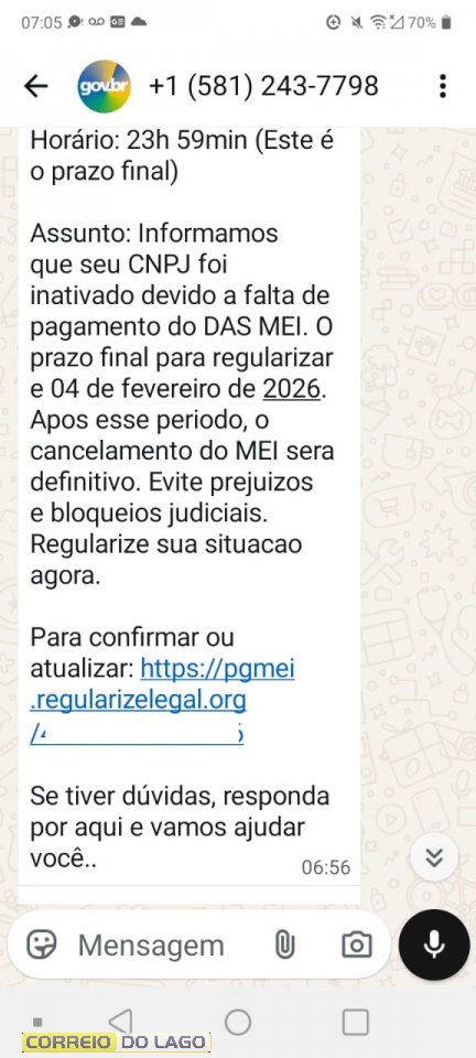 Na manhã desta quarta-feira (4), o Correio do Lago recebeu relatos de tentativas de golpe envolvendo microempreendedores individuais (MEI). Várias pessoas entraram em contato para verificar a veracidade de mensagens recebidas por WhatsApp que alertavam sobre a suposta suspensão do CNPJ.