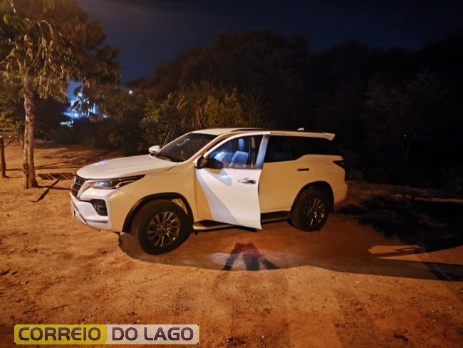 Durante a verificação do veículo, foi constatado que a caminhonete estava com o motor ligado, porém sem as chaves, além de apresentar danos na maçaneta da porta.