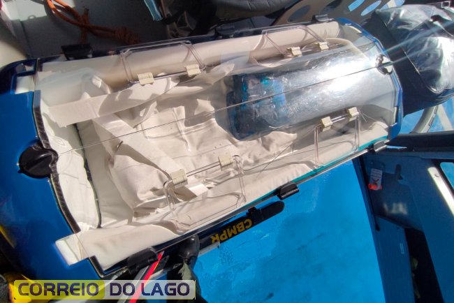 INCUBADORA - Diferente de incubadoras convencionais, que podem pesar cerca de 110 kg, a BabyPod é fabricada em fibra de carbono, pesa aproximadamente 8 kg e possui certificação europeia. O equipamento foi projetado para proteger o recém-nascido contra vibrações, impactos e variações de temperatura durante o voo, proporcionando um ambiente estável e seguro mesmo em situações críticas.