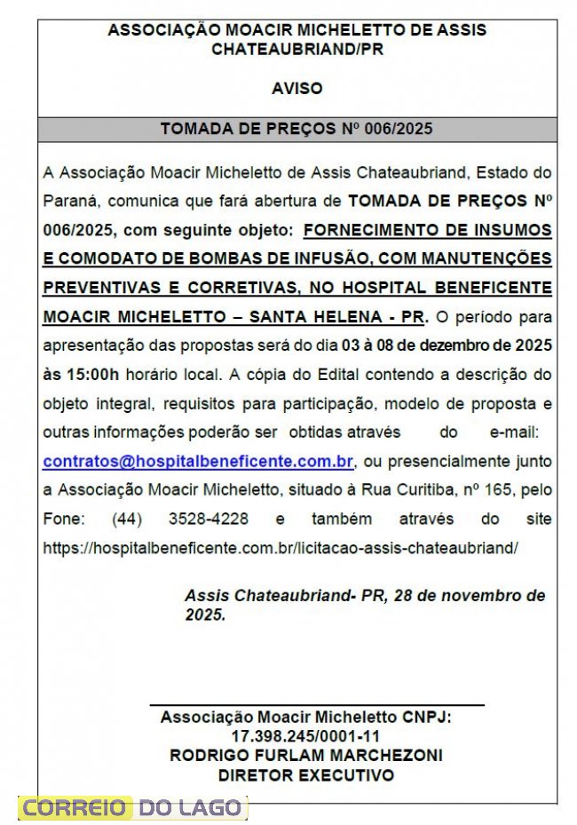 A Associação Moacir Micheletto de Assis Chateaubriand, comunica que fará abertura de TOMADA DE PREÇOS Nº 006/2025, com seguinte objeto: FORNECIMENTO DE INSUMOS E COMODATO DE BOMBAS DE INFUSÃO, COM MANUTENÇÕES PREVENTIVAS E CORRETIVAS, NO HOSPITAL BENEFICENTE MOACIR MICHELETTO – SANTA HELENA - PR.