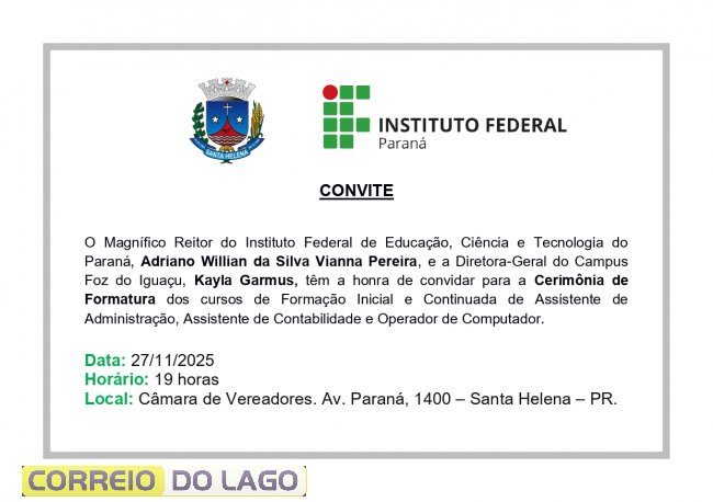O Instituto Federal de Educação, Ciência e Tecnologia do Paraná (IFPR) realiza nesta quarta-feira, (27), a Cerimônia de Formatura dos cursos de Formação Inicial e Continuada, marcando um momento especial para os concluintes de Assistente de Administração, Assistente de Contabilidade e Operador de Computador.