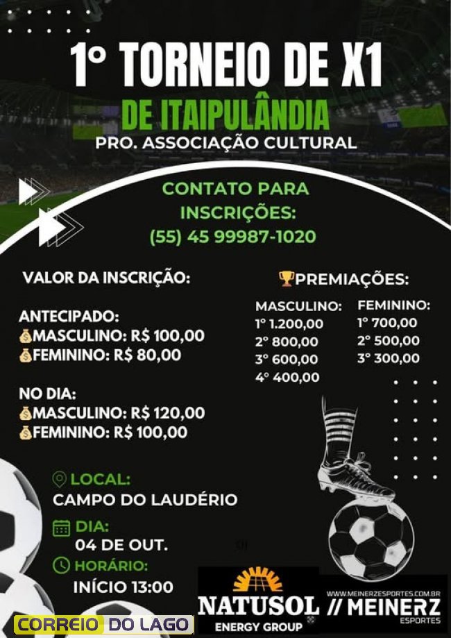 No próximo dia 4 de outubro, Itaipulândia será palco do 1º Torneio de X1, promovido pela Associação Cultural do município. A competição será realizada no Campo do Laudério, a partir das 13h, reunindo atletas nas categorias masculino e feminino.