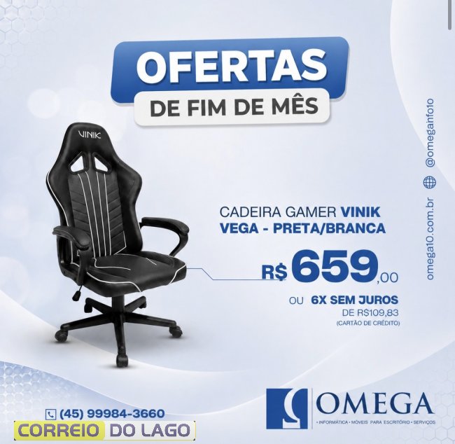 As ofertas de fim de mês da Ômega Informática chegam como a chance perfeita para quem quer mais conforto e estilo no dia a dia. A cadeira gamer Vinik Vega, nas cores preta e branca, é destaque da promoção, ideal para longas horas no computador, seja trabalhando, estudando ou jogando.