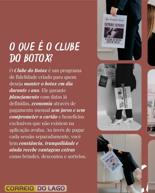 Os participantes recebem três aplicações programadas (testa, glabela e pés de galinha), além de brindes exclusivos, sorteios de preenchimento facial e descontos em outros procedimentos durante todo o ano. O pagamento é facilitado, sem juros e sem comprometer o limite do cartão, tornando o cuidado com a beleza ainda mais prático e acessível.