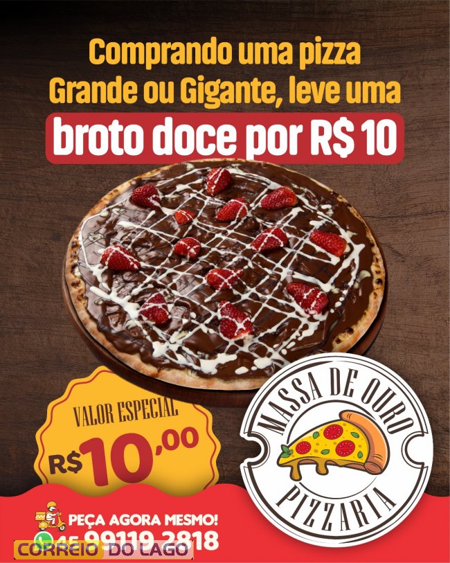 Nesta quinta-feira (23), a Pizzaria Massa de Ouro traz uma promoção deliciosa: na compra de uma pizza grande ou gigante, você leva uma pizza broto doce por apenas R$10. Uma forma saborosa de tornar sua noite ainda mais especial.