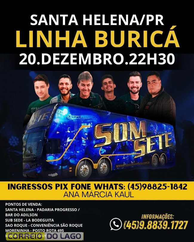 A comunidade de Linha Buricá, em Santa Helena, no Paraná, se prepara para uma grande noite de música e animação. No sábado, dia 20 de dezembro, acontece um mega-baile com o musical Som Sete, a partir das 23 horas, prometendo muita energia e sucessos para o público presente.