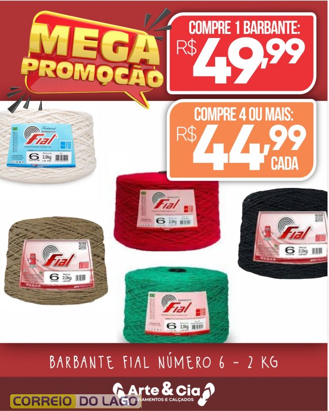 A Arte&Cia em Santa Helena lançou uma promoção que facilita a compra de barbantes para artesanato. O barbante Fial número 6 de 2 kg está disponível por R$ 49,99 na compra de uma unidade e cai para R$ 44,99 ao adquirir quatro ou mais.