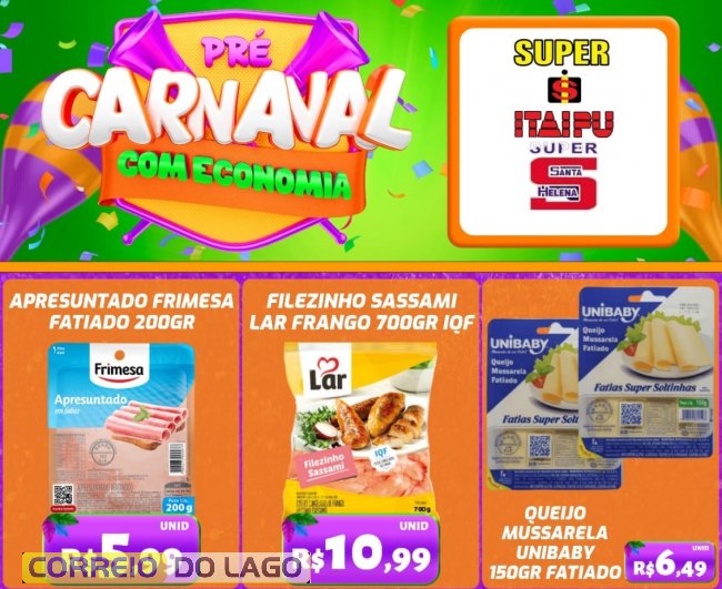 Nesta quinta-feira (12), o Super Itaipu e o Super Santa Helena realizam ofertas especiais das campanhas Pré-Carnaval com Economia e Quinta na Feira, com preços reduzidos no hortifrúti, frios, mercearia e itens básicos do dia a dia. As promoções são válidas apenas hoje ou enquanto durarem os estoques.