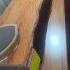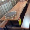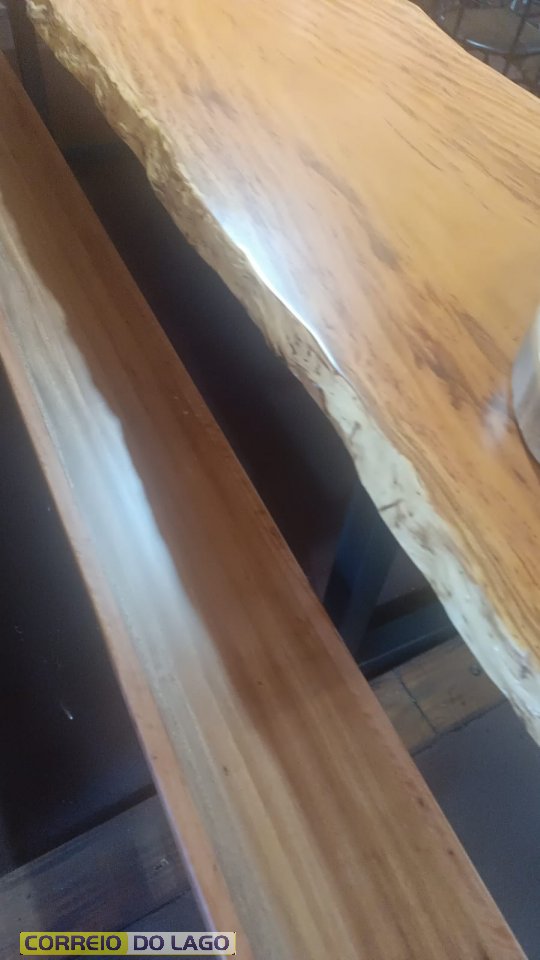 Entre os destaques está uma mesa inteiriça de aproximadamente três metros de comprimento, confeccionada em madeira de pequiá. O modelo chama a atenção pelo design robusto, no qual a própria madeira faz o arredondamento e forma o pé de um dos lados, valorizando o aspecto natural da peça.