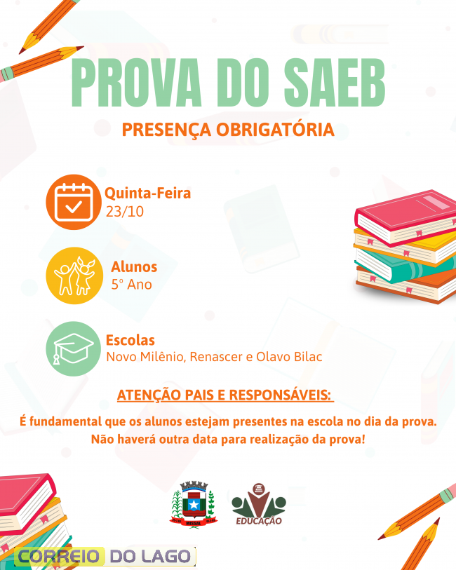 A Secretaria Municipal de Educação de Missal reforça o lembrete aos pais e responsáveis: na próxima quinta-feira, 23 de outubro, os alunos do 5º ano das escolas Novo Milênio, Renascer e Olavo Bilac irão realizar a Prova do SAEB (Sistema de Avaliação da Educação Básica).
