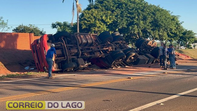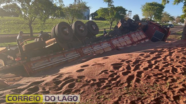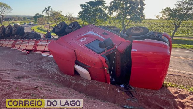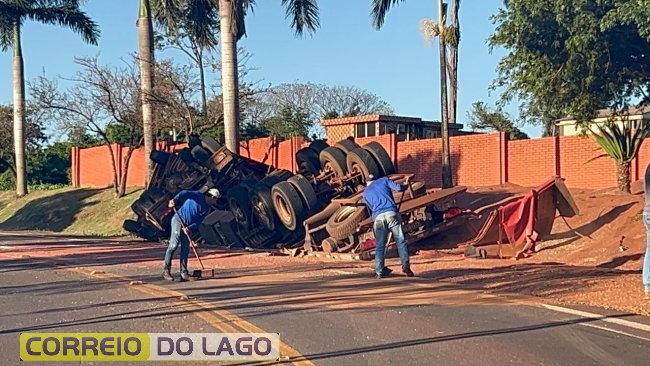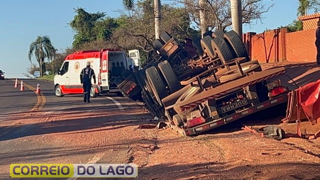 Na tarde desta terça-feira (14), uma carreta Scania modelo 124-420, com placas do Paraguai, tombou na rodovia PR-317, no trecho entre o distrito de Sub-Sede e Santa Helena.