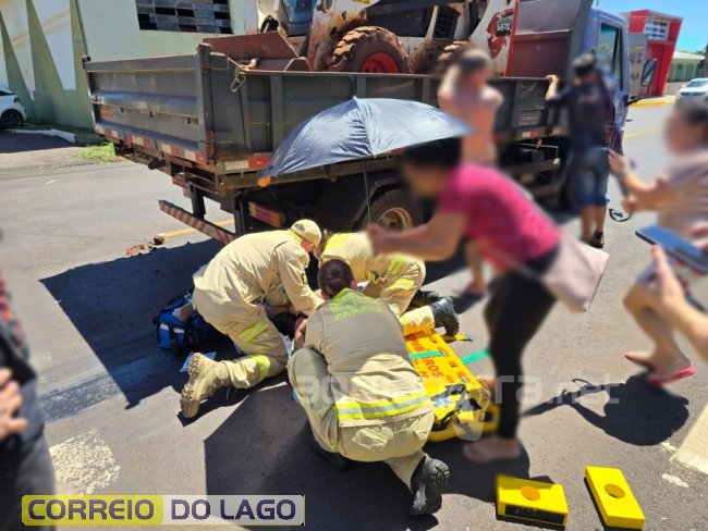 Mulher fica gravemente ferida em acidente entre moto e caminhão no centro de Marechal Rondon