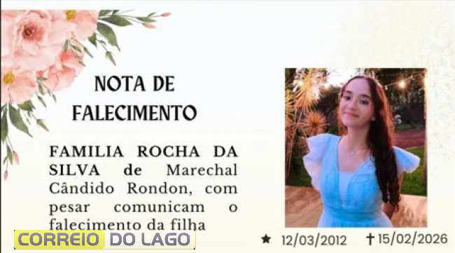 Familiares e amigos de Marechal Cândido Rondon e Santa Helena, comunicam com pesar o falecimento de Louise Valentina Rocha da Silva, ocorrido neste domingo (15), às 16h, aos 13 anos de idade.