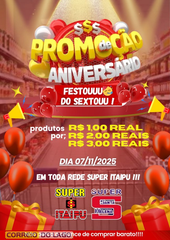 E na sexta-feira (7) tem mais: o “Festou do Sextou!” vai animar as lojas da Rede Itaipu com novas promoções, produtos a R$ 1,00, R$ 2,00 e R$ 3,00, e muita comemoração. Aproveite para comprar barato!